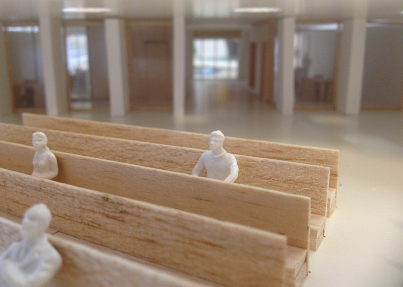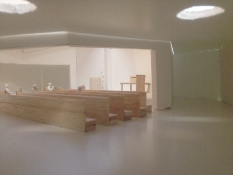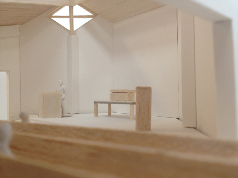 The plan is opened up to create more space for meeting after the service. The coffee corner is located on a central position with plenty of space around, in order to create opportunity for informal meetings before and after the services.