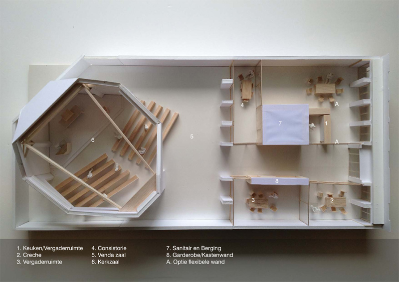 The proposed design consists of a clear organization of the formal programme. There is a direct spatious entrance. From the entrance zone the different meeting spaces are directly accessible. The kitchen is located in a central position with an number of orientations in order to allow various uses of the space. There is a logical location for the meeting room for the elderly in relation to the church space. The space can have a double use as a sunday school. Directly from the entrance the creche is accessible . The spaces are located as far as possible from the church hall in order to prevent noise.